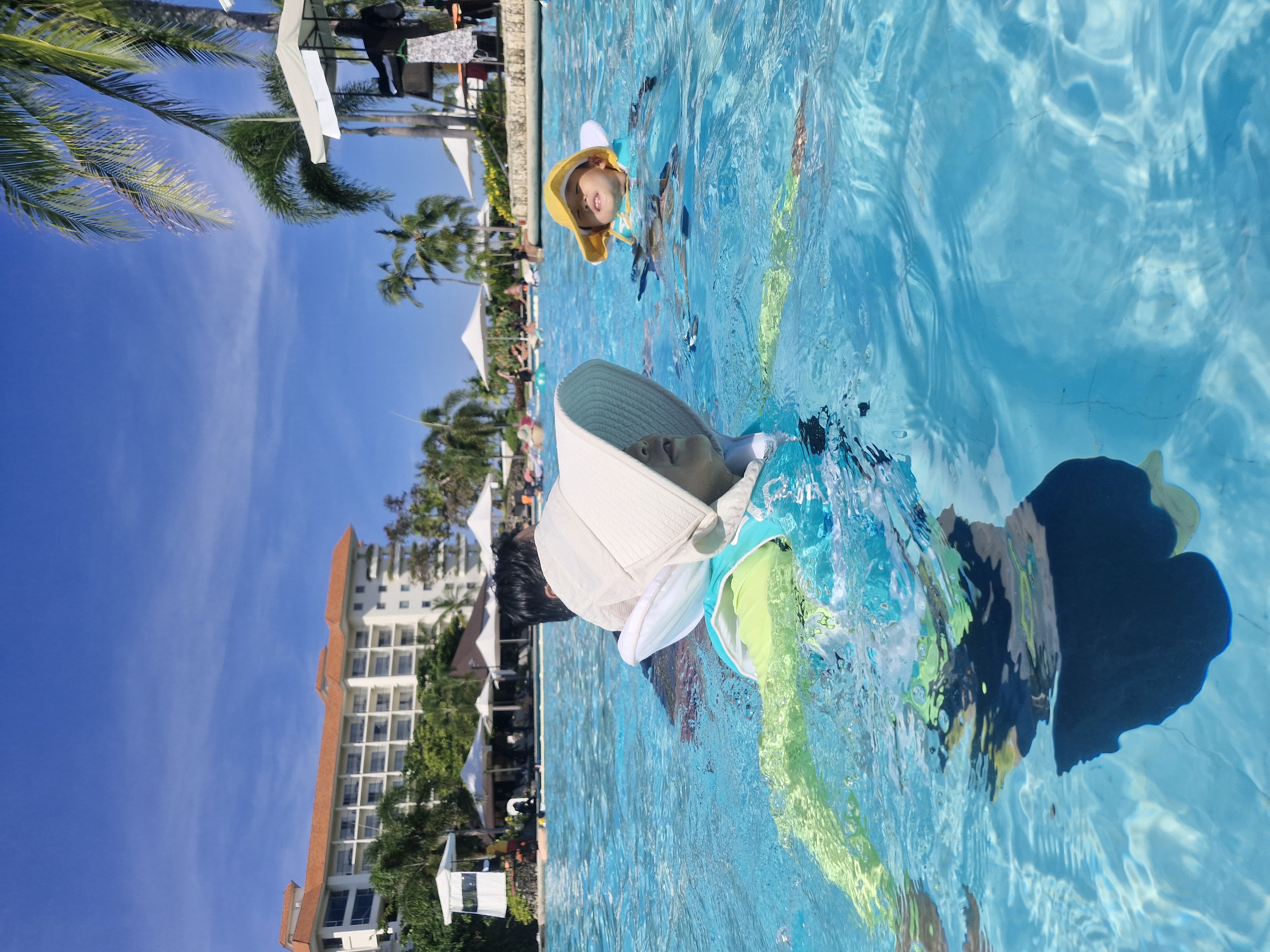 짐을 풀자마자 옷 갈아입고 수영장으로 내려갔습니다!