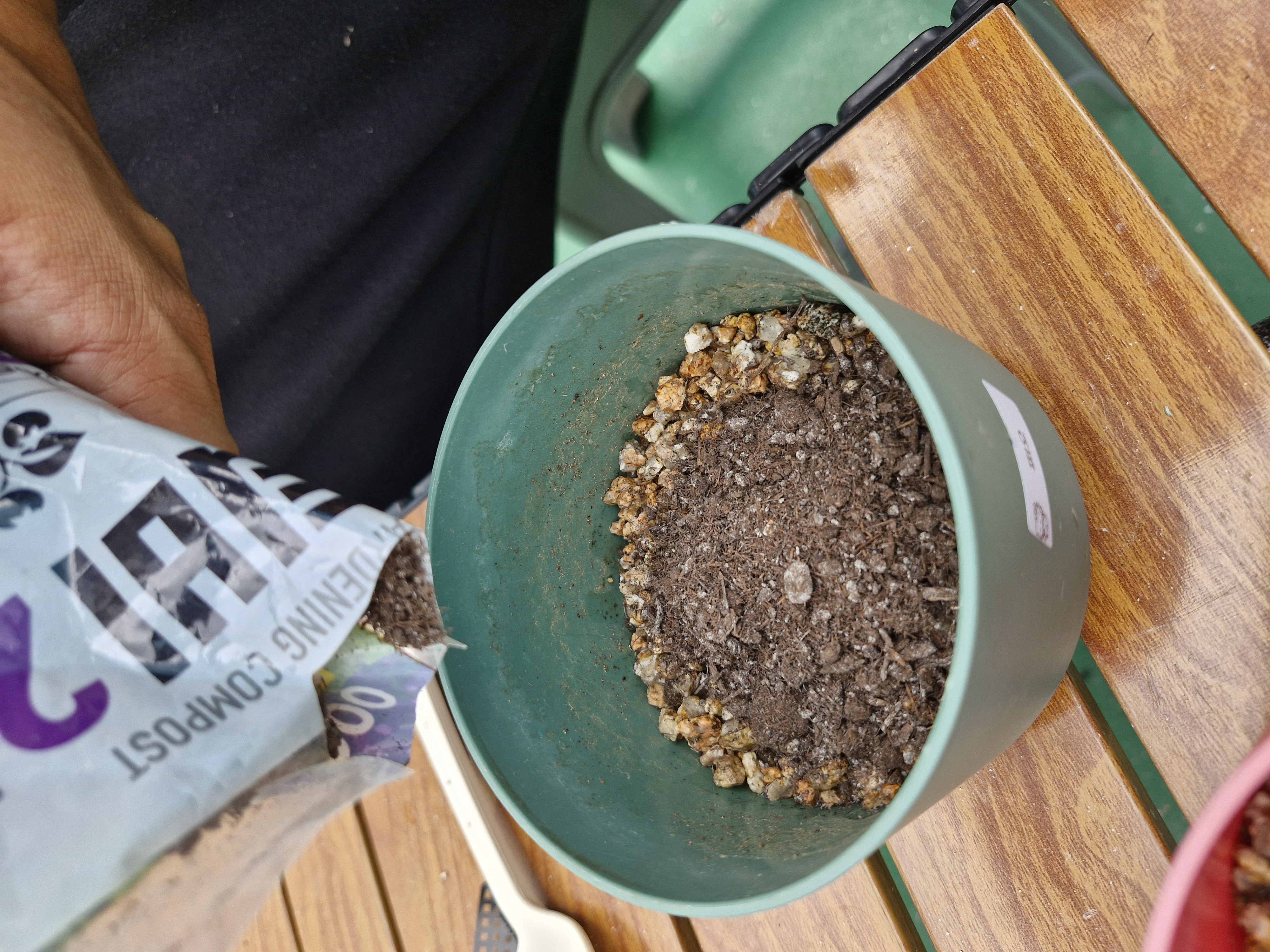 다음엔 상토와 펄라이트를 8:2 비율로 섞어 화분의 2/3 정도를 채웠습니다.