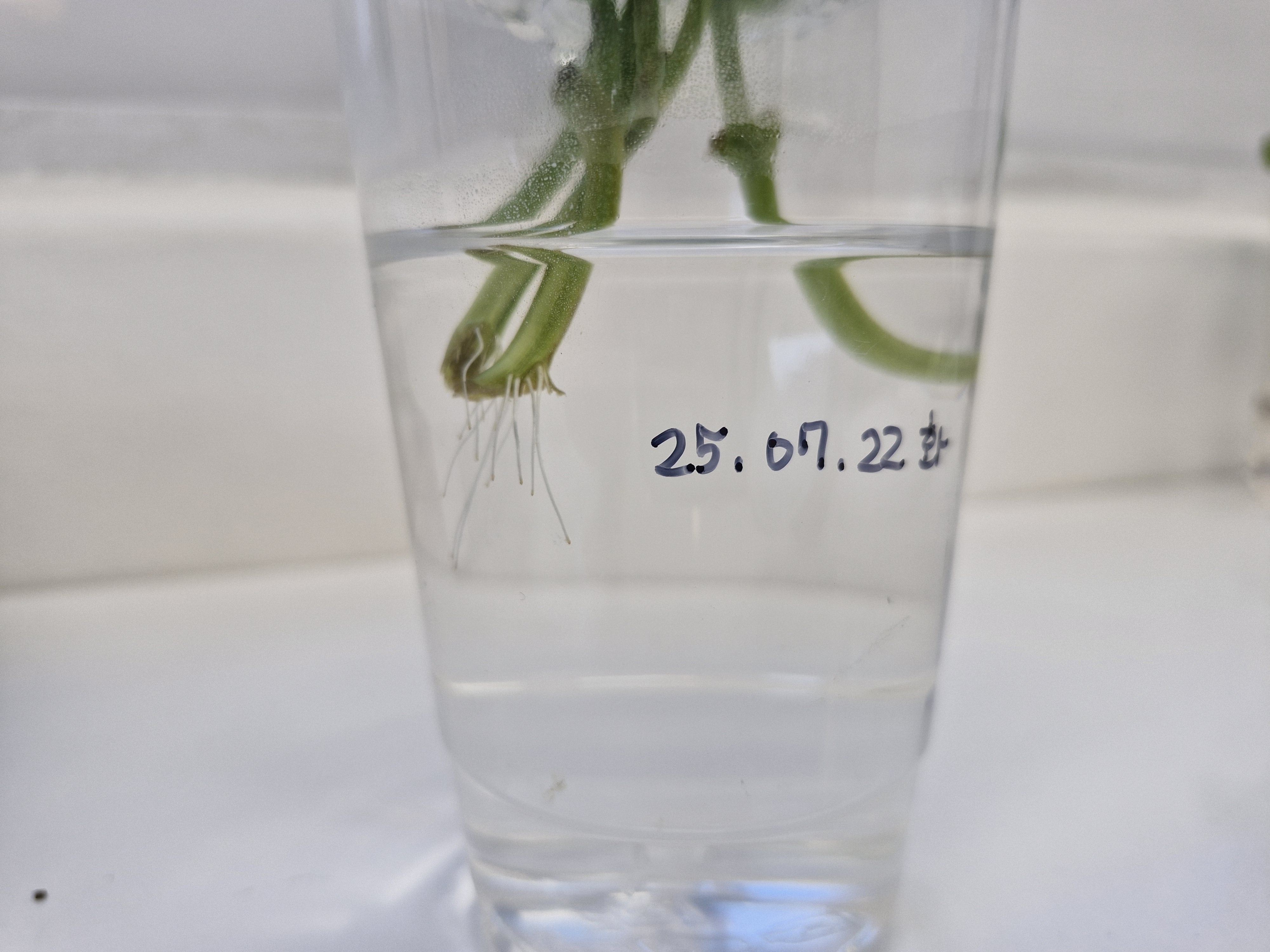 물속을 들여다보니 바질 줄기 끝부분에서 하얗고 가느다란 뿌리들이 쏙쏙 나오고 있었어요