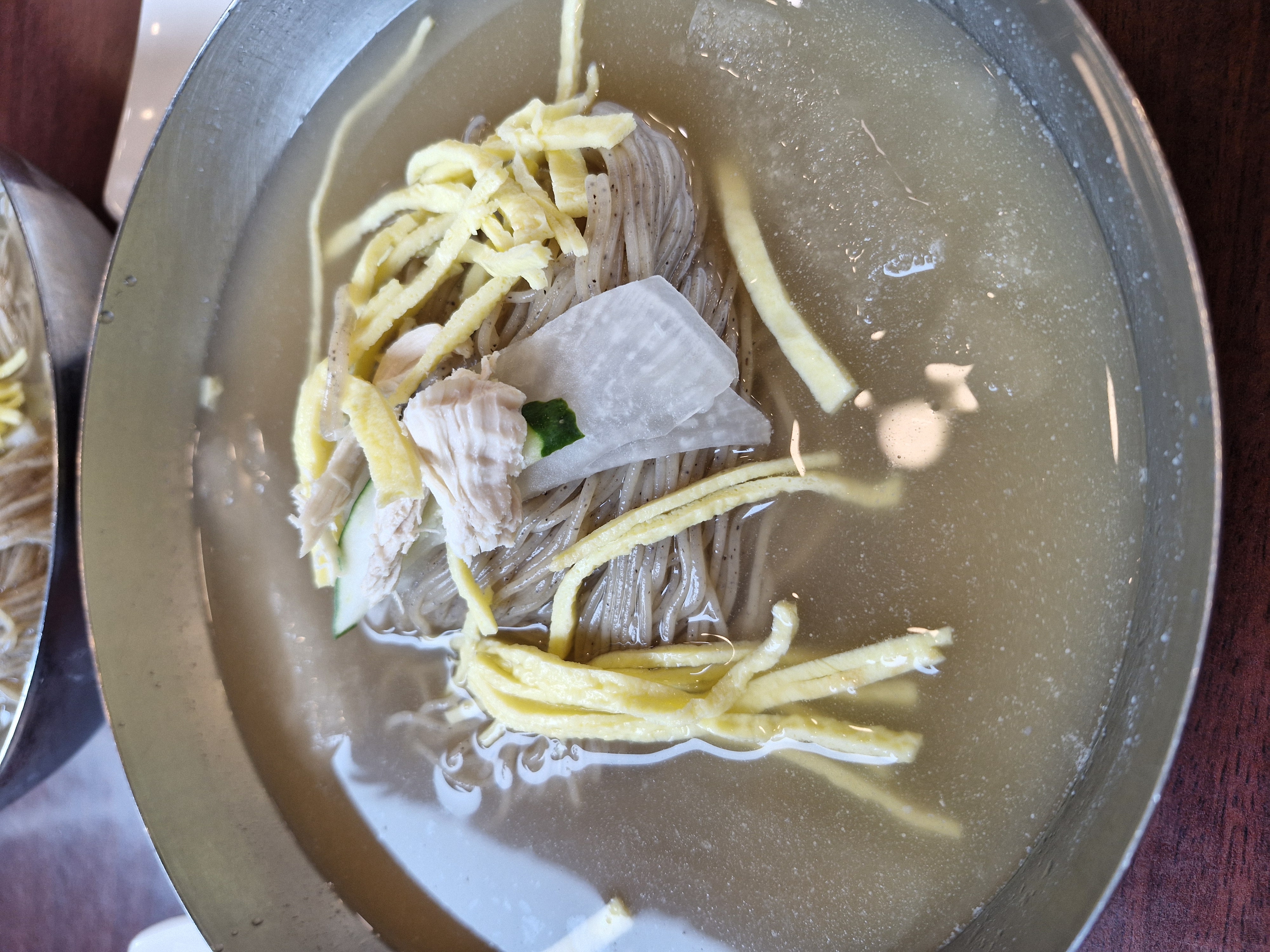 육수를 한 숟갈 떠먹어보니 깔끔하면서도 깊은 맛이 확 퍼지더라고요. 흔히 인공적으로 단맛을 낸 육수와는 확실히 차원이 달랐습니다. 은은한 고기 육향과 시원한 동치미 맛이 조화롭게 어울려서 계속 손이 갔어요. 면은 메밀 함량이 높은 듯했는데 부드러우면서도 쫄깃쫄깃한 식감이 정말 매력적이었습니다. 먹다 보면 육수와 면이 따로 노는 게 아니라 함께 어울려 목 넘김까지 부드럽게 이어지더라고요.
